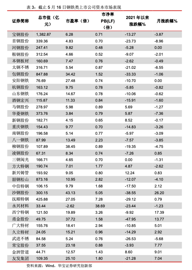 目前钢铁市场供需两端整体仍然偏弱,4月下旬以来,国内围绕稳增长涉及投资的相关政策不断加码。重点关注受益稳增长对建筑用钢需求拉动的相关公司。在中国经济高质量发展阶段,特钢板块的持续成长性确定强;2022年以来国内特钢进出价差大幅缩小,反映特钢在高端产品上替代进口、抢占海外份额有大幅提升。目前部分特钢上市公司经历近期的大幅下跌后,估值得到较大回调,关注部分估值处在历史低位的特钢公司。