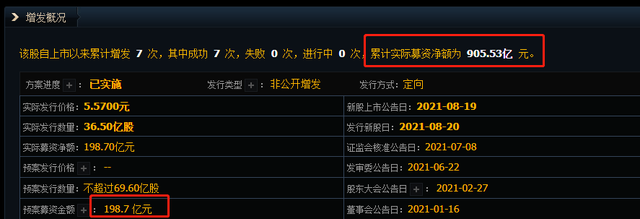 2001年上市以来,京东方A增发7次,募资净额905亿元。最近的一次在2021年7月,京东方A募资净额198.70亿元。