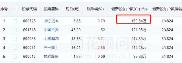 2022年4月底,京东方A是A股人气最高的股票,股东户数160万,比第二名的中国平安高出了将近40万户。