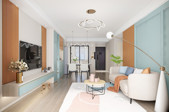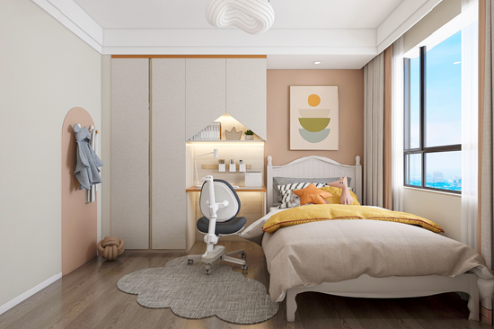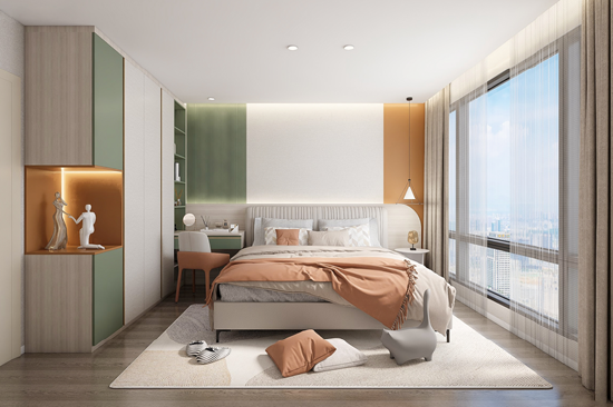整体色彩以杏叶橙作为整套方案的点睛之笔。客厅采用灰蓝色调,让人仿佛置身海洋世界般,宁静舒适;主卧采用莫兰迪绿,自然清新的气息,犹如徜徉在大自然般舒适自由;儿童房采用杏叶橙为主的色调,让童趣时光充满梦幻与活力。