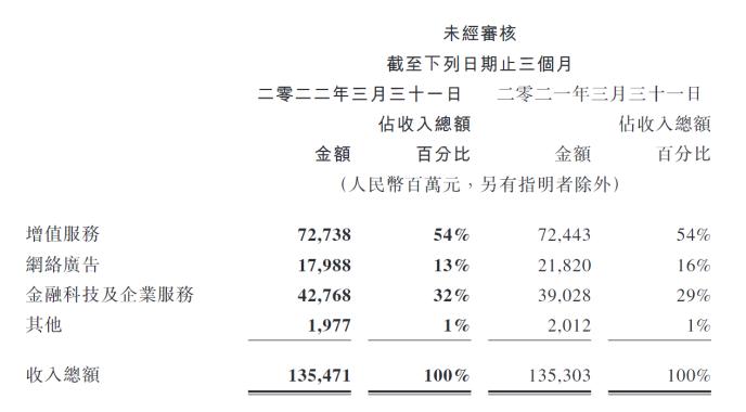 具体来看三大营收板块,一季度,包括游戏、社交网络在内的增值服务板块收入727亿元,同比增长1%,在总营收中占比54%;金融科技及企业服务板块收入428亿元,同比增长10%,占比32%;网络广告板块收入180亿元,同比下降18%,占比13%。