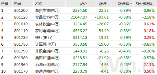 从下跌板块来看,商贸零售、食品饮料、农林牧渔、家用电器等板块跌幅居前。