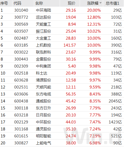 从电力设备板块个股表现来看,中环海陆、运达股份、天能重工、振江股份、大金重工、上机数控、联泓新科、金雷股份、中利集团、科士达、清源股份等10多只个股涨停或涨幅超10%。涨幅居前的个股中,主要是风电、光伏产业链公司。