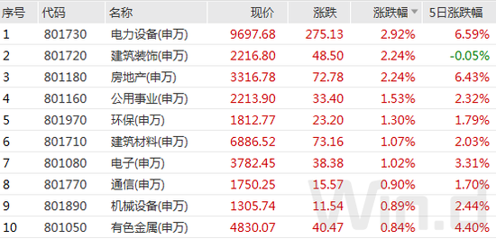 5月19日,由于A股市场整体反弹,行业板块亦多数上涨,其中,电力设备涨幅达2.92%,位居首位;建筑装饰、房地产、公用事业、环保、建筑材料、电子等多个板块亦涨幅居前。