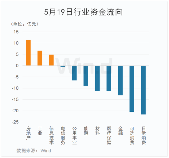 从5月19日行业资金流向来看,主力资金净流出70多亿元,多数行业净流出,其中日常消费和可选消费板块净流出额均超20亿元,位居前列;金融、医疗保健、材料等板块净流出额亦较高。房地产、工业、信息技术等板块则小幅净流入。