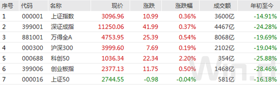 从主要股指表现来看,上证指数涨0.36%报收于3096.96点;深成指涨0.37%报收于11250.06点;创业板指涨0.50%报收于2377.13点,万得全A总成交8068亿元。