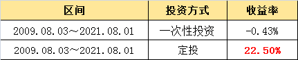 {文中定投计算数据来源:Wind,乌龟量化定投计算器;以上证指数为模拟定投对象,定投统计区间2009年8月3日~2021年8月1日;指数定投收益率通过定投计算器进行模拟,月定投扣款(即从开始定投日期起每月相应的日期持续定投),每月扣款1000元,非交易日顺延。定投收益公式:R=【(1000/x1+1000/x2+……1000/xn)*Xt – b】/b =【(1000/x1+1000/x2+……1000/xn)*Xt】/b–1;(R=累计收益率,x=买入价,n=定投次数,Xt=赎回日成交价,b=成本);一次性投资收益率=(当日收盘价-2009年8月3日收盘价)/2021年8月1日收盘价*100%}。注1:上述结果依据历史数据统计得出,仅供参考,不代表未来指数表现,亦不作为任何收益承诺。}