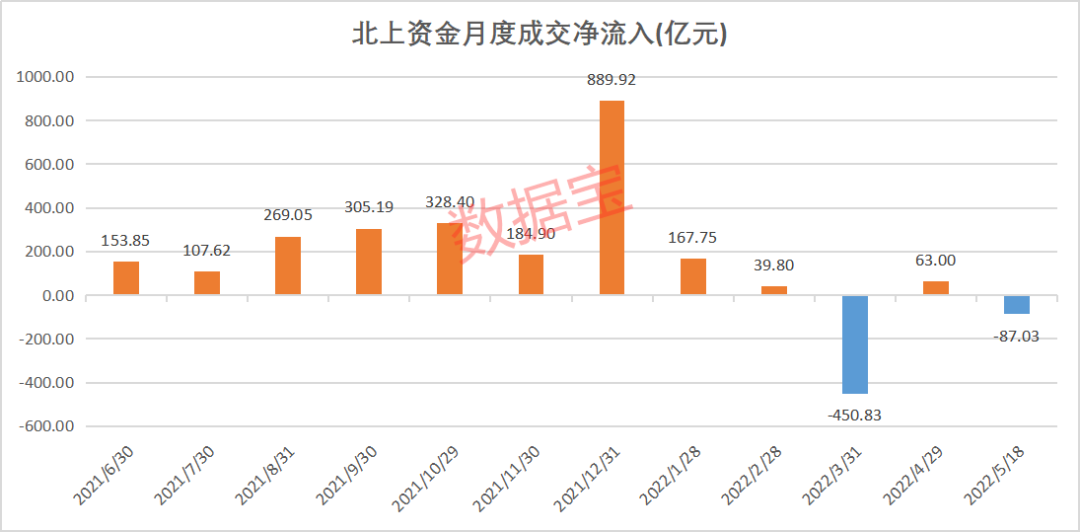 大盘震荡行情下,北上资金净流出。证券时报·数据宝统计,截至5月19日,北上资金月度净流出额超过85亿元,为年内第二高,也是2020年以来第四高。从单个交易日来看,5月16日、5月10日净流出额均超过75亿元。昨日市场低开高走,北上资金净流入51.24亿元,大幅缩减了本月流出金额。