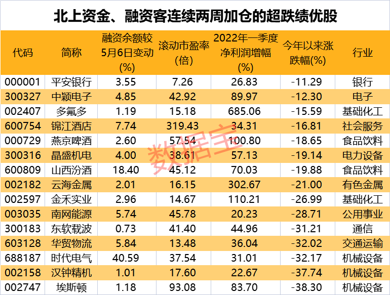 上述48股中,2022年一季度净利润增幅超过20%,年内跌幅超过10%的个股仅有15只,平安银行、华贸物流、金禾实业等市盈率低于15倍,埃斯顿、汉钟精机等5股年内回调超过30%。4股业绩翻倍,包括多氟多、云海金属、燕京啤酒等;融资客最新持仓较5月6日加仓幅度居前的有山西汾酒、锦江酒店等。