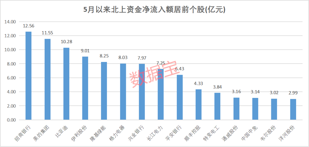 与此前相比,5月以来密集上榜北上资金成交活跃股从医药消费切换到新能源、家电等行业。招商银行本月净买入额居首,高达12.56亿元,美的集团、比亚迪净买入额超过10亿元。另外,伊利股份、隆基绿能、格力电器等净买入额均超过8亿元。