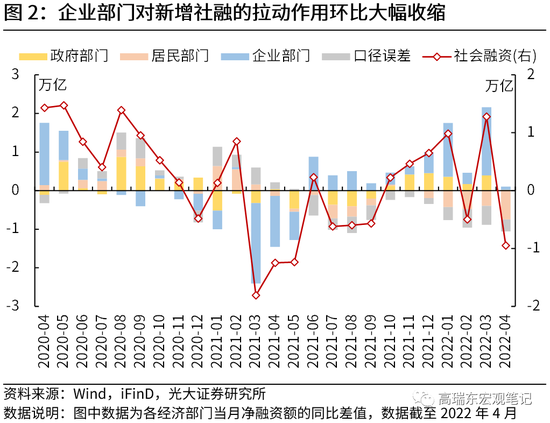实体经济和城镇就业压力反映在融资数据上,便是4月融资数据全面放缓,同时,企业和居民部门才是社会融资的主体,政府融资独木难支。疫情扰动下,实体经济全面承压,企业部门的投资扩产意愿和居民部门消费、购房意愿均明显收缩,表现在融资数据上便是,企业部门对新增融资的拉动作用环比大幅收缩,居民部门连续6个月维持拖累且拖累程度持续走阔。