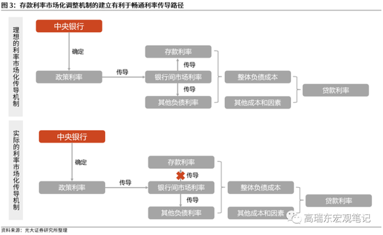商业银行的综合负债成本主要可以拆分成三个部分,一是存款负债成本,二是同业负债成本,三是其他负债成本。政策利率向存款利率传导的阻滞,使得央行在调降政策利率时,更多地只能通过银行间市场利率和其他负债利率影响商业银行综合负债成本,而占商业银行综合负债成本大头的存款负债成本却未受影响,货币政策的传导效率便大打折扣。