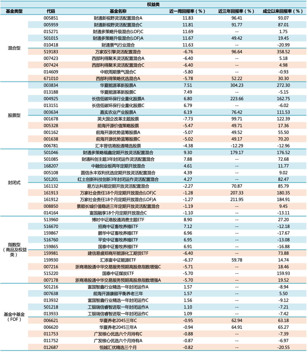 表2:上周各权益类基金收益表现(涨幅前5位及跌幅前5位)