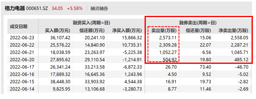融券卖出从6.20-6.23被大幅卖出6000w股,约20多亿元。目前格力总市值2000左右,这几天融券做空累计占比1%左右。