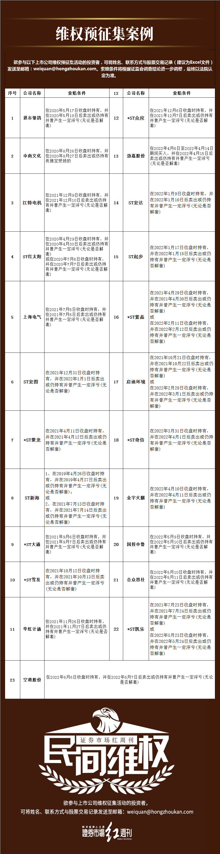 欲参与上市公司维权征集活动的投资者,可将姓名、联系方式与维权个股交易记录发送至邮箱: