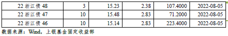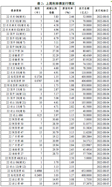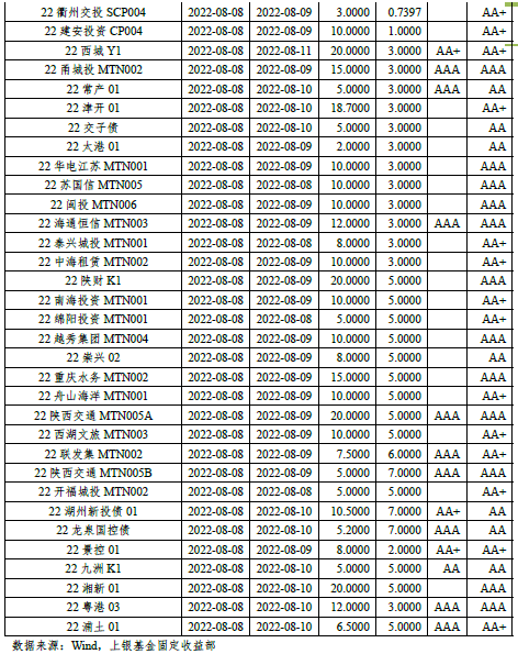 一级市场:上周利率债(含地方债)发行量回升近2050亿元至5473.61亿元,净融资额也上升3643.9亿元至3995.86亿元。上周国债发行量较大,但均为1Y期及以下品种,投标倍数较低;地方债发行规模较小,安徽债、陕西债和辽宁债的超额认购倍数在30倍上下;政金债投标情绪较高,7Y国开债的超额认购倍数超过7倍,3Y和5Y国开和农发债超额认购倍数超过5倍。