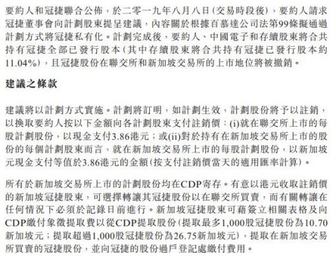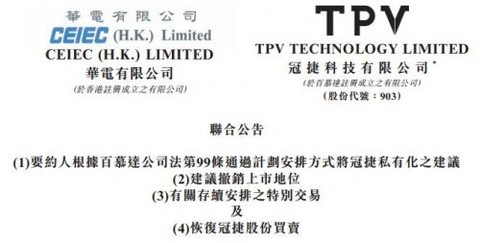 计划完成后,冠捷股份在港交所和新加坡交易所的上市地位将被撤销。