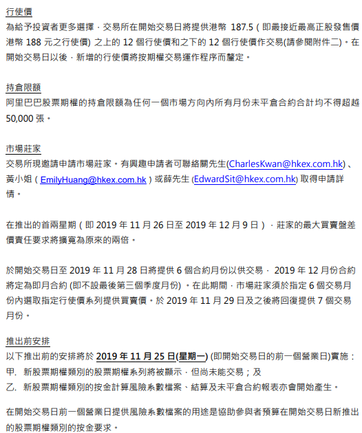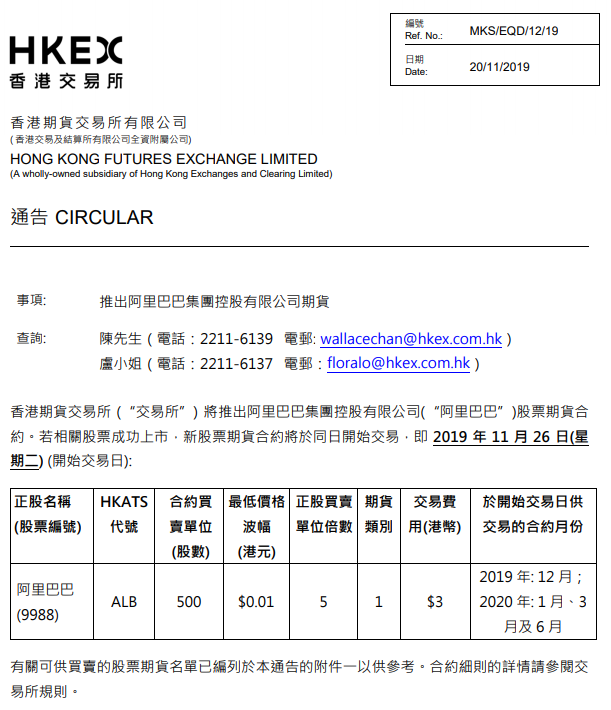 11月20日,港交所最新公告显示,香港联合交易所有限公司将推出阿里巴巴集团控股有限公司股票期权合约。若相关股票成功上市,新股票期权将于2019年11月26日(星期二)(「开始交易日」)同日推出,港交所同时还推出阿里巴巴集团控股有限公司期货,预计新股票期货合约将于同日开始交易,即也是2019 年 11 月 26 日(星期二) 。