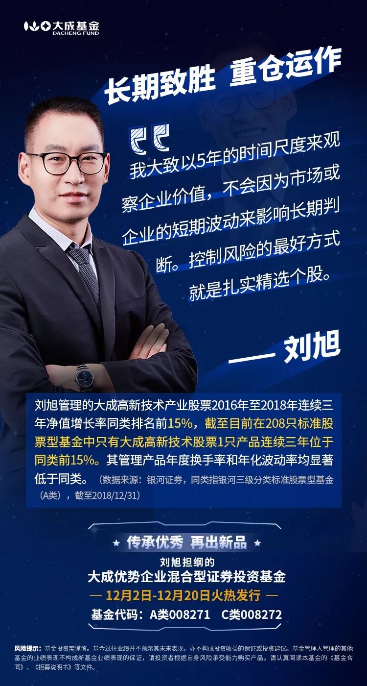 最近刘旭也有新基金要发行,名字是大成优势企业,这只新基金在费率设计上要比老产品好很多,比如有了A/C两类基金份额,A类份额的赎回费持有满6个月就降低到0.1%,都比老产品要友好一些。