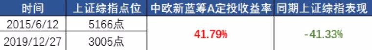 若从近5年市场高点(2015/6/12,上证综指5166点)开始定投“中欧新蓝筹A”,坚持持有至今,定投总收益率41.50%!而同期上证综指跌幅41.33%。