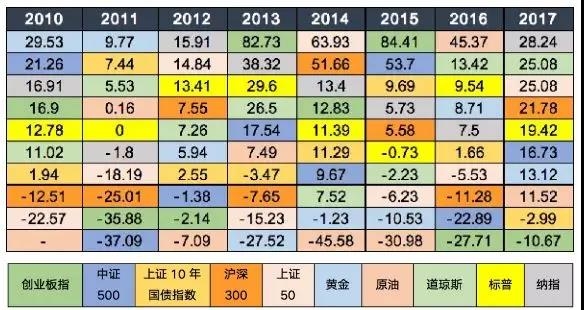 从2010-2017历年市场表现看,每年表现好的前几类资产各不相同,没有一类资产会永远表现最好。比如2010年大盘(中证500)和黄金表现更好;而2017年则是创业板指表现更优秀,把中证500和黄金远远甩到一边。