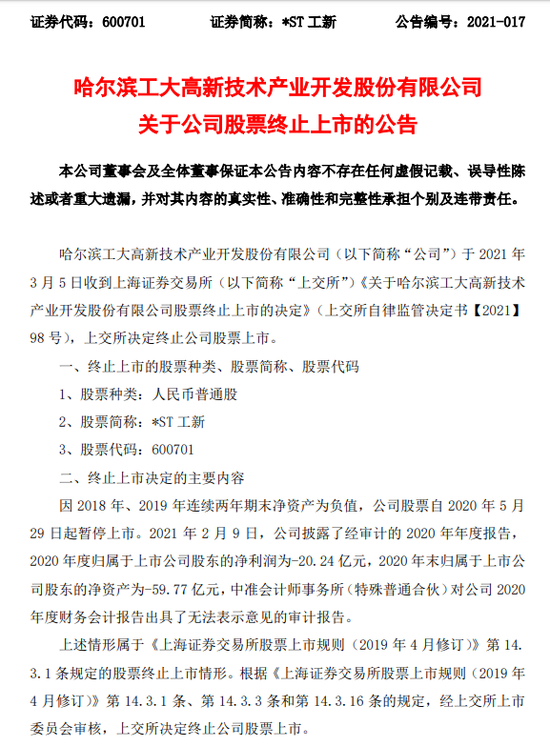 今日晚间,*ST工新发布公告称,3月5日收到上海证券交易所《关于哈尔滨工大高新技术产业开发股份有限公司股票终止上市的决定》,上交所决定终止公司股票上市。