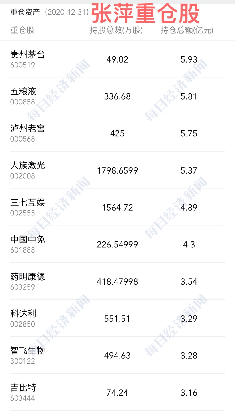 最后来看看她的最新重仓股情况(截止2020年底所管基金合计前十大重仓股,按市值排序,下同):
