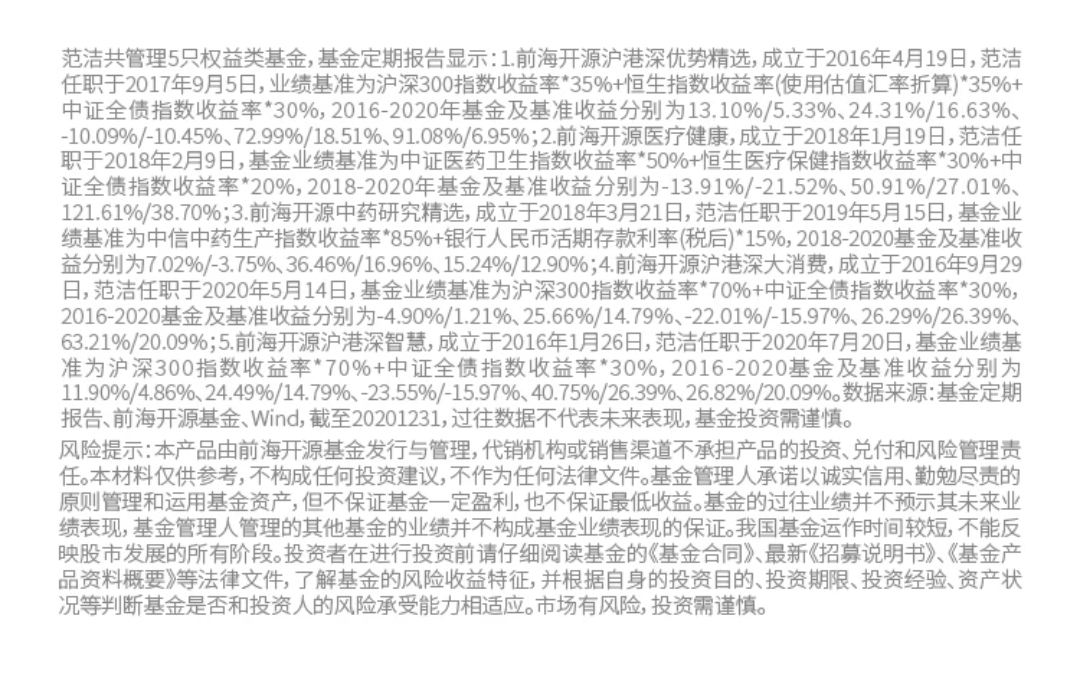 医药成为近几年资本市场最热门的投资主题之一。从公募基金的业绩表现来看,医药主题基金去年收益率位居全市场前列。晨星数据显示,前海开源医疗健康混合基金2020年收益率121.61%,同类排名第一,由基金经理曲扬和范洁共同管理。其中,基金经理范洁是医药背景出身,证券基金从业经历长达7年。