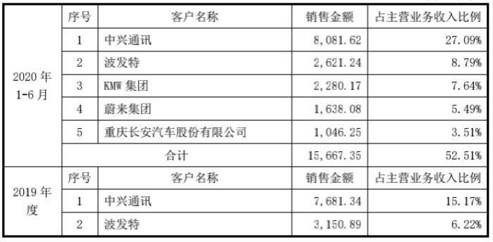 值得注意的是,瑞可达在新能源汽车领域的营业收入占比及总额均逐年减少,2017-2020年上半年,新能源汽车领域营收分别为2.6亿元,3.1亿元,2.6亿元,1.1亿元,占比分别为63%,70%,51%,36%,而此前的五大客银隆新能源、宁德时代、奇瑞汽车、蔚来汽车等,均呈现不同程度的变动。对此,瑞可达在招股书中解释,新能源汽车的补贴政策退坡冲击了新能源汽车的市场需求,导致整车厂面临大规模洗牌,同时整车销量放缓导致连接器产品供应商竞争加剧。