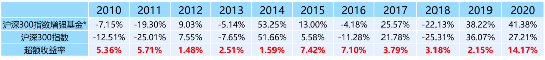沪深300指数增强基金过去11年相比指数的增强表现一览