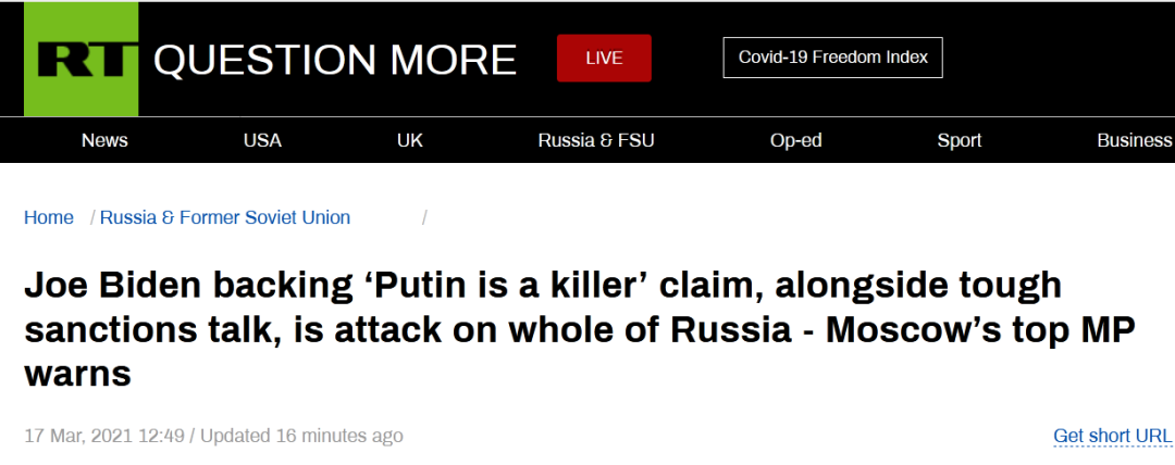 RT:莫斯科高级议员警告,拜登支持“普京是杀手”及有关严厉制裁的言论,是对整个俄罗斯的攻击