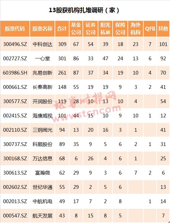 iFinD数据显示,个股方面,中科创达上周累计接待机构达309家,位居首位;一心堂接待301家调研机构,排名第二,兆易创新接待261家机构,排名第三位。