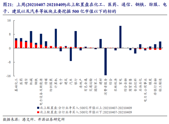 上周(20210407-20210409)外资配置盘净买入A股59.46亿元,外资交易盘净卖出79.61亿元。行业上,北上配置/交易盘的分歧仍大,两者共识在于买入机械、非银、轻工、石油石化等行业,同时卖出食品饮料、消费者服务、汽车、农林牧渔、电力及公用事业等行业。对于白酒板块,外资配置盘卖出白酒板块(-7.58亿元),其中净卖出贵州茅台3.28亿元。分市值看,上周北上配置盘在化工、医药、通信、钢铁、纺服、电子、建筑及汽车等板块主要挖掘500亿市值以下的标的。
