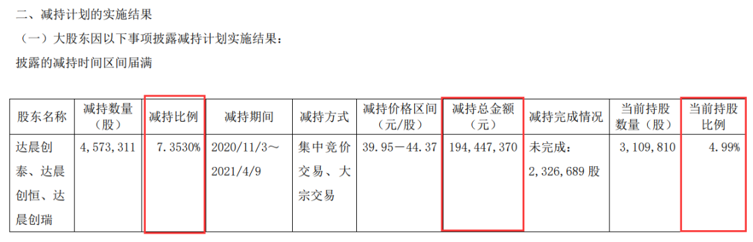 另一个“疯狂减持”则是来自知名创投机构——深圳市达晨财智创业投资管理有限公司(下称达晨)。热景生物4月15日的一份公告显示,达晨旗下的3只产品,共持有公司12.35%的股份,从去年11月3日至今年4月9日,合计减持了7.3530%的股份,减持金额将近2亿元,在减持完成后仍持有4.99%的股份。