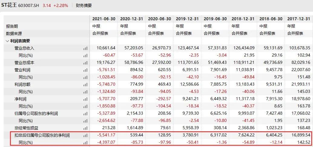 数据显示,花王股份自上市后,无论是营收、净利,还是归母净利、扣非归母净利,无一例外全部一年不如一年。最新的2021年中报显示,归母净利和扣非归母净利终于出现亏损,亏损金额均超过5000万元,同比下降2655%和4397%,对于一个总市值仅10亿元的上市公司来说,实在无异于“五雷轰顶”。