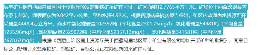 中证君注意到,该公告同样约定,辰宇矿业表层卤水锂储量10万余吨(已探明),地下浅层卤水锂储量约20万吨(以实际探明储量为准),正在办理采矿权证。