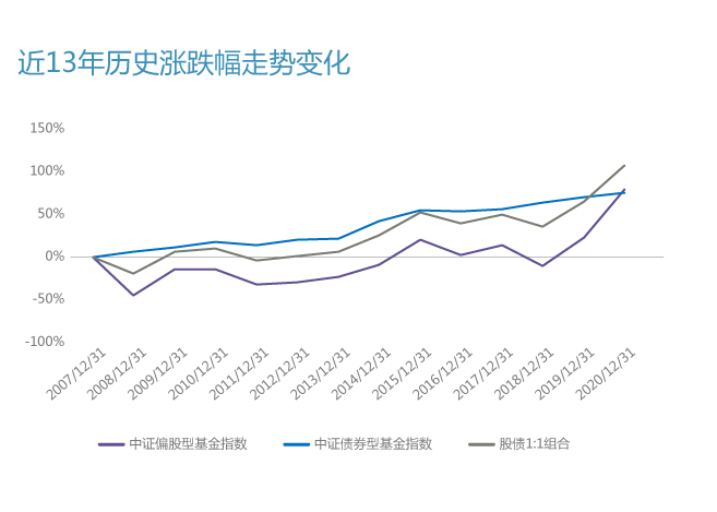 然而神奇的是,进一步统计近13年的累计涨跌幅便会发现,较累计涨幅分别为89.5%及85.67%的偏股型、债券型基金指数而言,股债1:1组合累计涨幅高达逾122%,表现显然更佳!