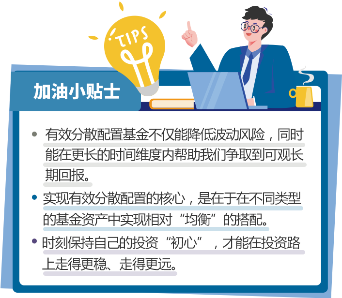 有小伙伴可能会误认为,分散配置不就是简单粗暴地多买几只基金嘛?其实,“分散”强调的并不是数量多寡,而是要在不同基金资产之间实现相对“均衡”的搭配。上述的股债1:1组合,就实现了有效分散配置。