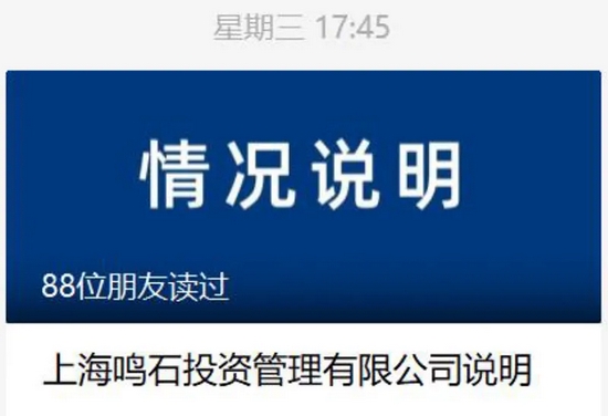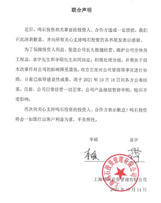 10月15日凌晨三点,鸣石投资微信公众号发布声明称,袁宇和李硕共同决定:积极处理分歧,并聚焦于将本次事件对公司的影响降至最低。双方正在对公司管理等事宜进行协商,目前已取得建设性成果,将于2021年10月18日向各方公布结果。