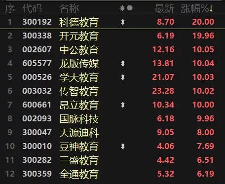当天,在线教育掀涨停潮成为市场焦点。早间,在线教育指数高开1.4%后直线拉升,盘中涨幅一度达到4.3%,随即高位整理,截至收盘,板块指数涨3.05%,其中科德教育、开元教育、学大教育、传智教育、昂立教育涨停。