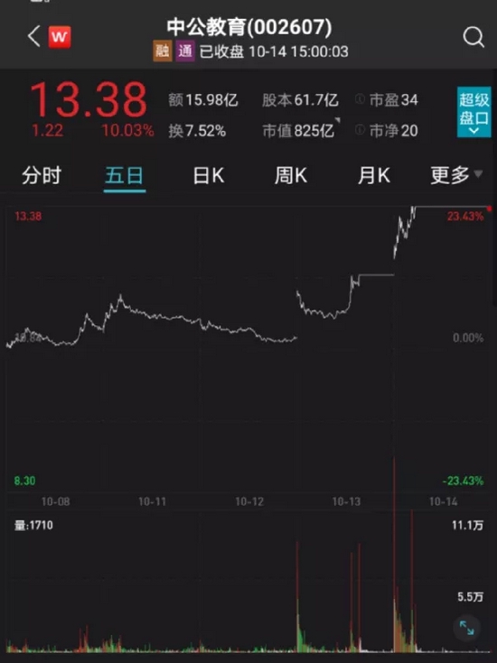 10月14日,A股教育板块大幅走高。中公教育股价报收于13.38元/股,总市值达到825.2亿元,全天成交额近16亿元,截至收盘仍有超11万手封单。
