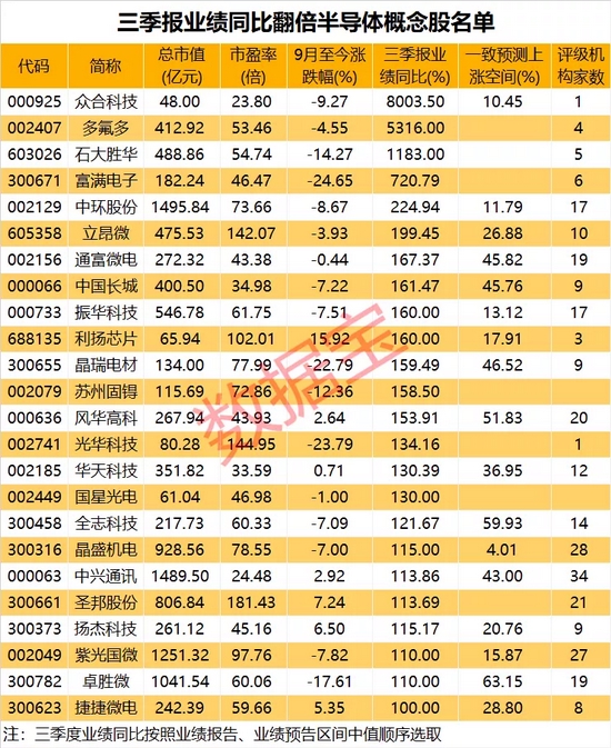 证券时报·数据宝整理了三季报业绩同比翻倍半导体概念股名单。业绩十倍以上个股有3只,分别为众合科技、多氟多和石大胜华。机构关注度来看,12股获10家及以上机构评级。中兴通讯以34家遥遥领先,晶盛机电、紫光国微、圣邦股份和风华高科评级家数也在20家以上。