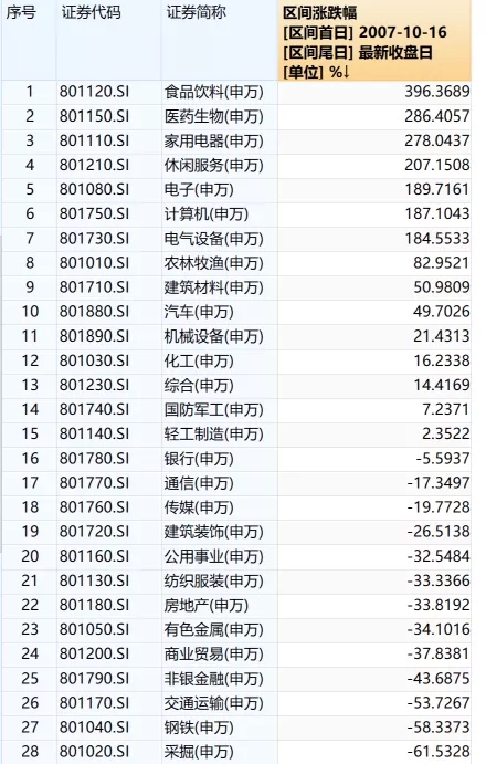 从申万一级行业来看,6124点以来,28个行业仅有15个上涨,其中食品饮料行业暴涨396.37%,医药生物、家用电器、休闲服务涨幅均超过200%,分别为286.41%、278.04%、207.15%。这也解释了为什么基金获得较好收益,同时也是基金业绩分化较大的原因。