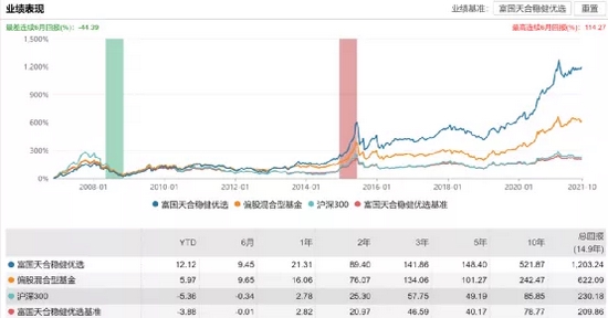 富国天合稳健优选也表现不错,也是成立于2006年11月,在6124点以来收益达到413.42%,位居第三。从基金经理来看,最早是周蔚文管理该基金,一直到2011年1月12日离任,期间任职回报达到140.94%,年化回报为23.51%,也奠定较好基础。目前管理基金是张啸伟,2015年11月19日至今任职总回报为143.42%,表现也不俗。