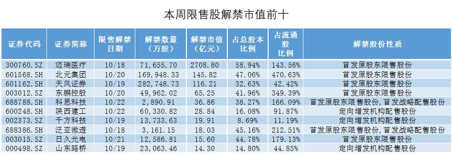 本周解禁的公司中,医疗器械龙头迈瑞医疗(300760.SZ)一家独大。