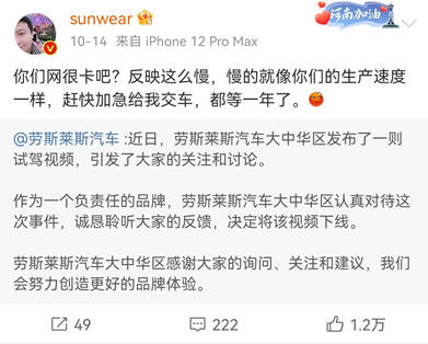 他取走现金之后放入了一辆汽车中,该车随后被火眼金睛的网友发现是劳斯莱斯。有意思的是,前几天劳斯莱斯因为邀请网红夫妻拍摄视频推广汽车而饱受争议,吐槽的人当中就有@sunwear:“你们网很卡吧?反映这么慢,慢的就像你们的生产速度一样,赶快加急给我交车,都等一年了。”