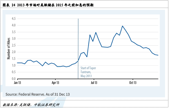 2013年,市场误读了美联储的意图,对美联储货币转向进行了“过度的超前预判”。由于用量化宽松对资产负债表进行调整的方法对当时的美联储而言是全新的举措,市场对美联储后续政策路径缺乏清晰认知。市场参与者无法区分资产购买变化与改变货币政策宽松立场之间的区别,导投资者过度预期了未来货币政策收紧的力度与节奏。