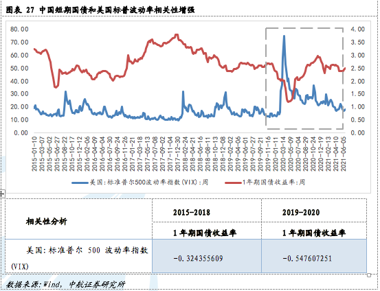 而中国政府债券收益率与全球金融市场状况之间的联系也变得更加紧密。自2019年中美贸易摩擦之后,芝加哥期权交易所(Chicago Board Options Exchange)波动指数和我国1年期国债收益率相关性明显增强。与美国市场关联性的增强意味着在量化宽松退出时,我国金融市场或与美国和其他亚洲市场同步震荡。