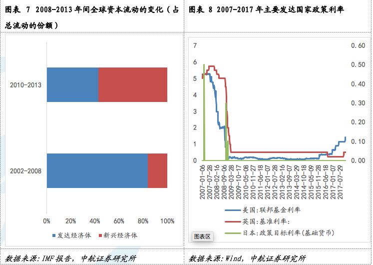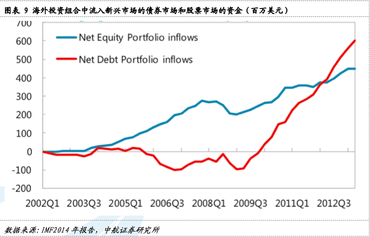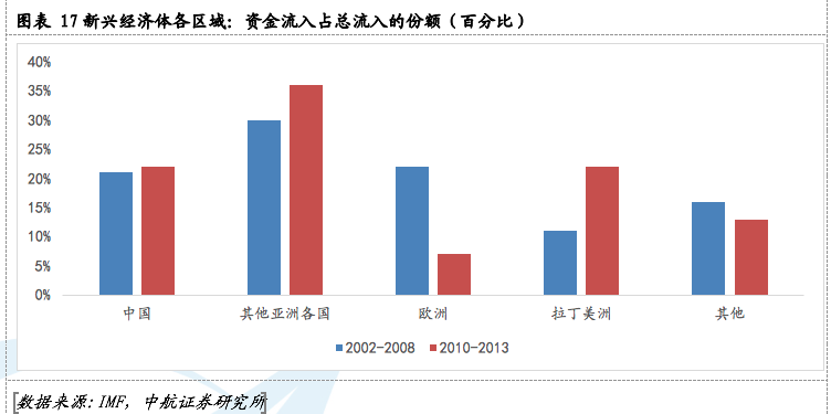 从性质来看,金融危机后,新兴市场资本流入大幅提高的主要来源是强劲的投资组合资产流入,特别是债券市场。外国投资在新兴市场本币政府债券市场持有比例的大幅上升使得新兴经济体资本市场与外部资本的关联度提升,从而也就更容易受到全球避险情绪突然上升的影响。