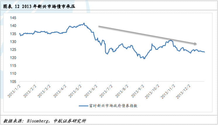 然而,持续的高速的增长显然是不可持续的。新兴经济体从2010年开始增长放缓。2013年,经济体增长所依赖的大宗商品繁荣见顶,价格下跌,新兴经济体的优势消失,而此时发达市场增长略有加速。市场上关于新兴经济体增长不可持续的观点增加,多年的高速经济增长使新兴经济体的追赶潜力降低,在其他条件相同的情况下,增长率必将下降。而此时美联储关于缩减购买计划的表态使风险较低的替代投资—美债变得更具吸引力。外国投资者对新兴市场投资有效性质疑加上可替代投资的收益增长导致大规模资本流出新兴市场。